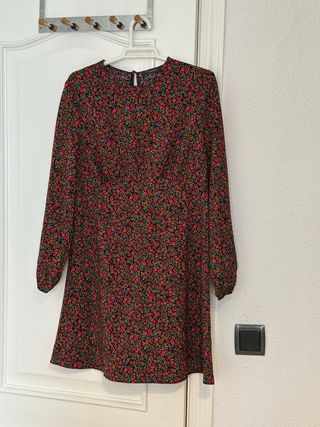 Vestido con estampado de flores sobre fondo negro y detalles rojos. - Diseño con volantes. - Manga larga. - Cuello redondo. Es negro con puntos blancos y estampado de rosas. Precio negociable