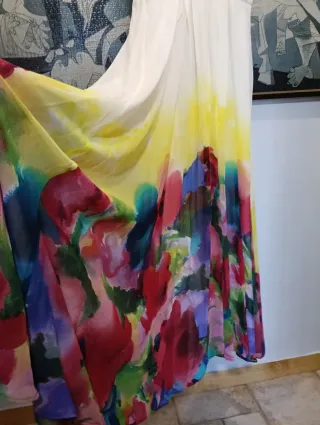 Elegante vestido de fiesta largo con un diseño de princesa. - Cuerpo superior tipo corsé. - Falda vaporosa de tela translúcida. - Tirantes finos. Te regalo el fular El corpiño resalta con reflejos brillantes