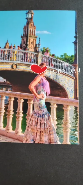 Vestido de flamenca con un diseño vibrante y llamativo. - Estampado detallado en tonos multicolor. - Adornado con flecos en la parte superior. - Falda con volantes y encajes. -Talla 38/40 - Largo, 1'50.