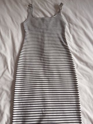 Vestido de rayas finas en blanco y negro. Un básico versátil para cualquier ocasión. - Diseño de tirantes. - Corte ajustado. - Tejido elástico.