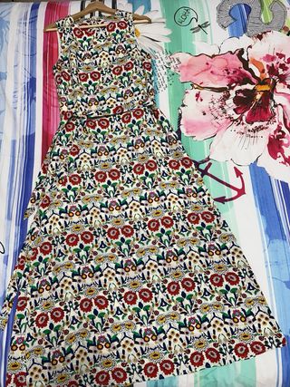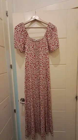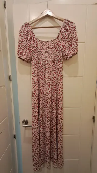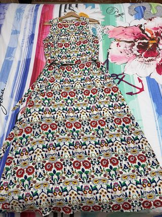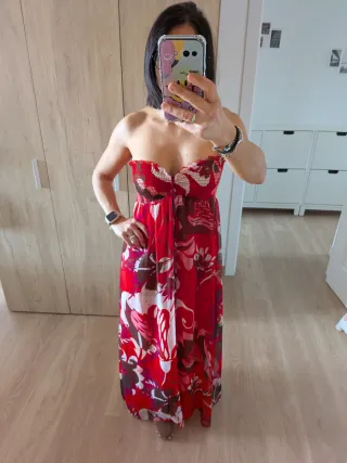 Precioso vestido largo con un estampado floral vibrante. Es una prenda elegante y cómoda, ideal para diversas ocasiones. Como nuevo, solo usado una vez. Se puede usar atado al cuello o palabra de honor. La tela del pecho es elástica y da bastante talla. Sirve perfectamente para S y M - Diseño sin tirantes. - Cintura elástica fruncida. - Falda larga y fluida.