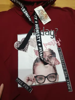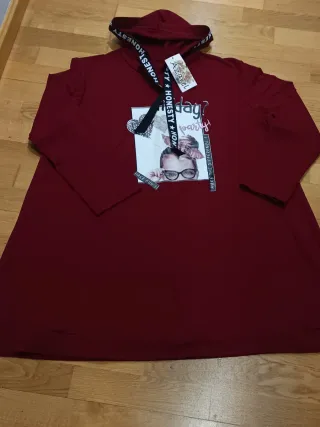 Vestido informal con estampado frontal y detalles en capucha. - Estampado Happy day? party. - Capucha con cinta HONESTY. - Mensajes MAKE FUN I y MAKE THE DIFFERENCE. - Diseño tipo túnica. Color burdeos