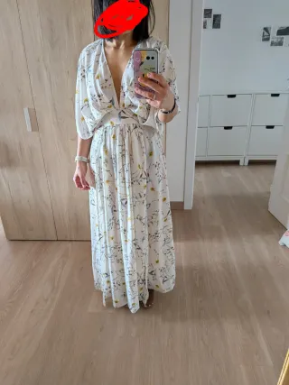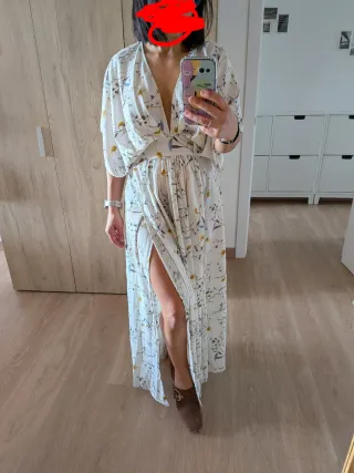 Precioso vestido largo con un estampado floral. Su diseño vaporoso lo hace muy cómodo y elegante. Usado solo una vez para un evento. - Corte maxi con abertura lateral. - Escote pronunciado en V. - Cintura marcada para estilizar la figura. - Mangas amplias y fluidas.