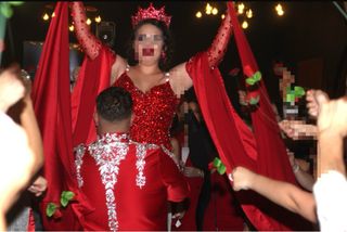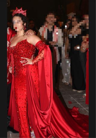 Vestido de segundas rojo talla 36-38 con cola ,mangas y complementos