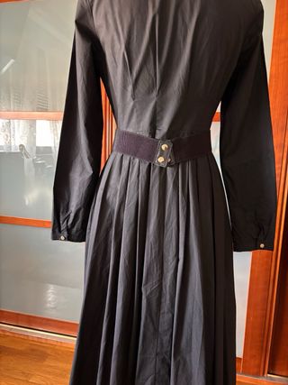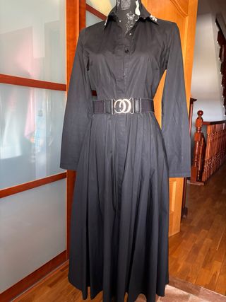 Elegante vestido camisero de Teria Yabar. Un diseño clásico y versátil. - Manga larga. - Cuello camisero. - Adornos en el cuello. - Falda amplia con vuelo.