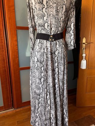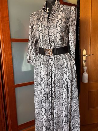 Vestido largo de Zara con un llamativo estampado de serpiente en tonos grises y negros. Presenta un diseño camisero con botones y cinturón a juego. - Diseño camisero. - Cinturón incluido. - Largo maxi.
