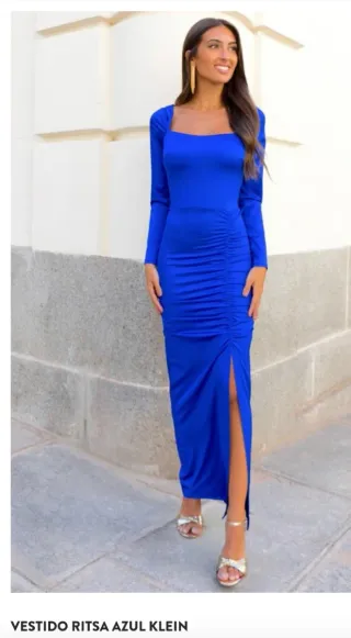 Vestido largo de fiesta en color azul Klein. Presenta un diseño elegante con escote cuadrado y manga larga. - Detalle de fruncido lateral. - Abertura en la pierna. - Tejido elástico. *El vestido es la talla mas pequeña ( mirar medidas en la última foto).