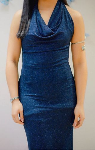 Vestido largo azul ajustado con abertura.