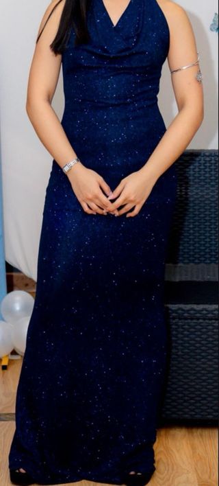 Vestido ajustado pero con tela muy elástica. Se adapta muy bien a la figura del cuerpo. • Mido 1.53m de referencia, la foto es usando tacones. Es talla única. La parte del cuello se puede ajustar, ya que tu misma haces el nudo. Súper cómodo! Perfecto para graduación o cumpleaños. Usado UNA vez! Cualquier duda escríbeme.