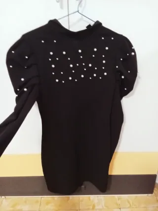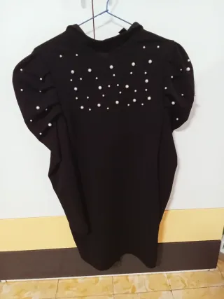 Elegante vestido negro adornado con perlas. - Diseño con cuello alto. - Mangas abullonadas. - Detalle de perlas decorativas en el corpiño y las mangas.