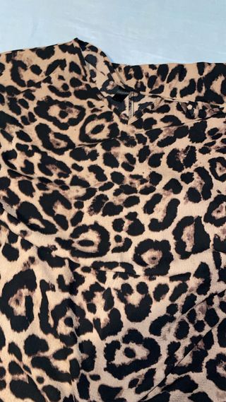 Vestido corto con estampado de leopardo que realza la figura. - Diseño con tirantes finos. - Detalle de fruncido central. - Bajo con volante de tul. - Cordón ajustable en el bajo.