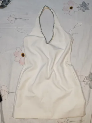 Vestido de Zara con un diseño elegante y moderno. - Escote halter con detalle de pedrería. - Corte recto y favorecedor. - Ideal para eventos especiales.