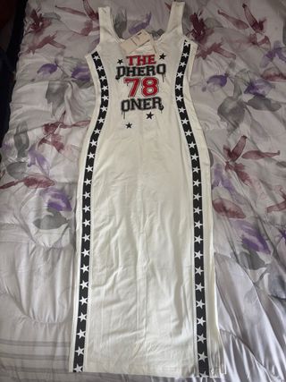 Vestido largo de corte ajustado con un diseño llamativo. Talla S/M - Diseño con estrellas en los laterales. - Estampado THE DHERO 78 ONER en la parte delantera. - Escote redondo. - Abertura lateral.