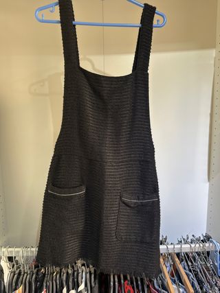 Vestido tipo pichi de tejido tweed con un diseño moderno. - Detalle de bolsillos frontales con ribete plateado. - Acabado deshilachado en el bajo. - Tirantes anchos.