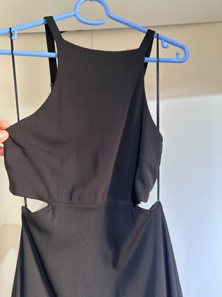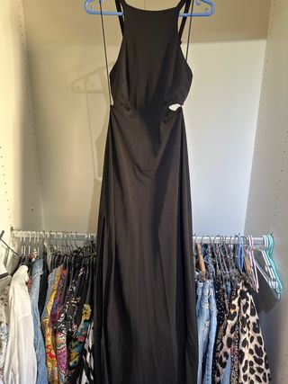 Elegante vestido largo negro con detalles modernos. - Diseño cut out en los laterales. - Abertura lateral muy pronunciada en la falda. - Tirantes finos que se pueden regular