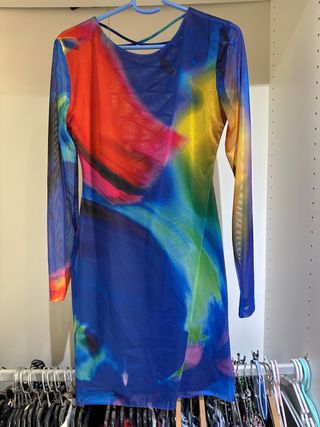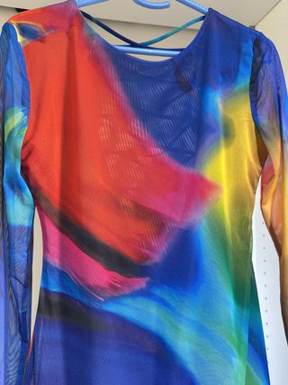 Vestido con un vibrante estampado abstracto. - Diseño de manga larga. - Escote con tiras cruzadas en la espalda. - Tejido translúcido.