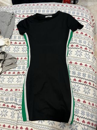 Vestido ceñido de manga corta con detalles laterales. - Diseño ajustado. - Rayas laterales en verde y blanco.