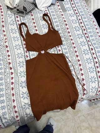 Vestido marrón con un diseño moderno y atrevido. - Tejido texturizado. - Abertura central. - Detalle de anilla metálica. - Tirantes finos.