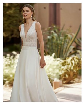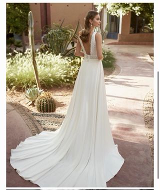 Vestido de novia Alma, sin estrenar. Modelo leticia coleccion 2025. - Diseño elegante y moderno. - Escote en V con detalles de encaje. - Cintura marcada con banda de encaje. - Falda fluida de corte A.
