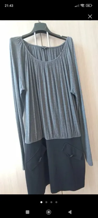 Vestido de manga larga con falda. - Parte superior gris con cuello redondo. - Falda negra con bolsillos.
