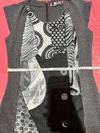 Vestido corto con un diseño patchwork muy original. - Estampado frontal con diferentes texturas y motivos. - Detalle de botones en la parte delantera. - Logo de Desigual bordado en la parte inferior.Tiene elasticidad,