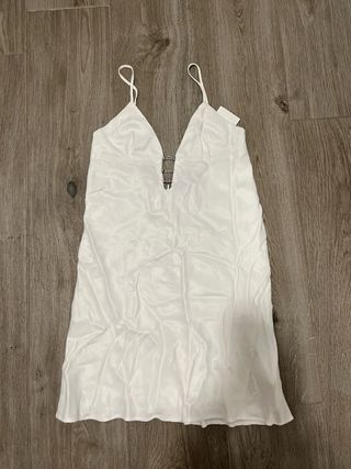 Vestido corto de tirantes de Zara en color blanco. Presenta un detalle de pedrería en la zona del escote. - Tirantes finos. - Escote pronunciado con detalle de pedrería. - Tejido satinado.