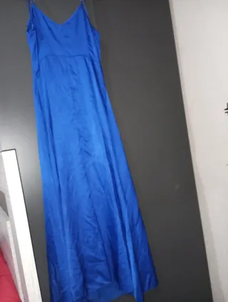 Vestido largo de corte elegante en color azul. - Diseño con tirantes finos. - Detalle de fruncido lateral. - Abertura en la pierna.