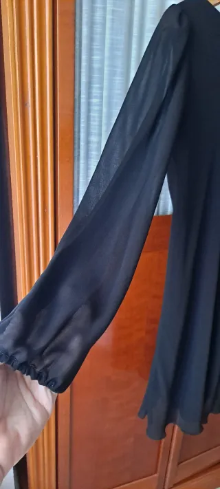 Vestido fluido de manga larga.El tejido es muy ligero y con caída. Mangas transparentes y el resto va forrado. Detalle especial de la espalda con varias tiras cruzadas. El bajo ondulado.