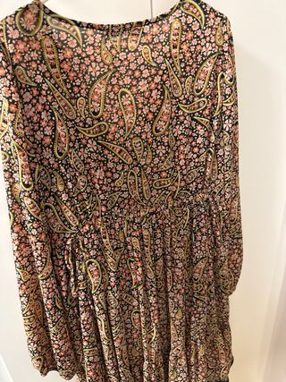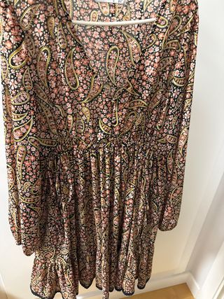 Vestido con un bonito estampado paisley y floral. - Diseño con escote en V. - Cintura elástica. - Mangas largas. - Bajo con volantes.