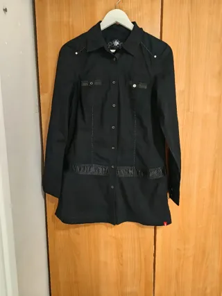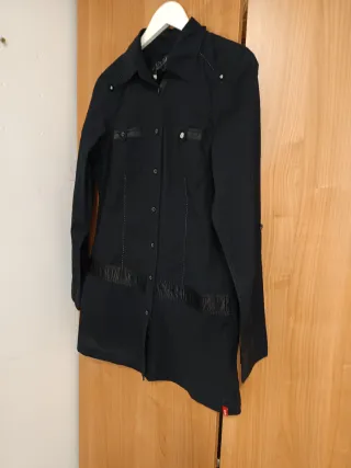 Vestido camisero de manga larga con detalles únicos. - Cuello camisero. - Cierre de botones. - Dos bolsillos en el pecho. - Adornos de pedrería y cinta satinada en la parte inferior. Medidas largo 78 cm medidas de axila a axila 49 cm medidas de hombro a hombro 40 cm. Como Nuevo puesto en 2 ocasiones.