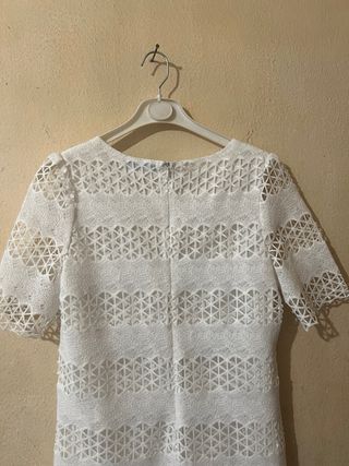 Vestido blanco con un diseño de encaje muy especial. Ideal para cualquier ocasión. - Mangas cortas. - Diseño de encaje con motivos geométricos. - Cierre de cremallera en la espalda.