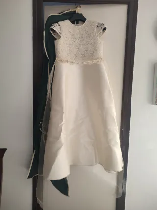 Vestido de comunión con un delicado diseño. - Cuerpo de encaje. - Cintura adornada con pequeñas flores y perlas. - Falda de satén. - Incluye funda protectora.
