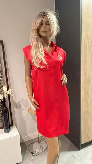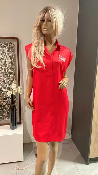 Vestido de la marca Moschino en color rojo. - Diseño con cuello tipo polo. - Manga corta. - Detalle de logo en el pecho. Talla 40 italiana que corresponde a S/M