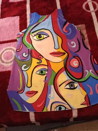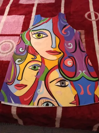 Vestido fresco con un diseño artístico y vibrante, perfecto para el verano. - Estampado abstracto de rostros. - Diseño sin mangas. - Tejido ligero y cómodo.