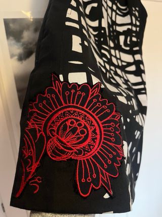 Vestido de edición limitada con un diseño gráfico llamativo. usado solo 1 vez - Estampado abstracto en blanco y negro. - Detalle bordado en rojo en la parte inferior. - Forto interior - cremallera trasera