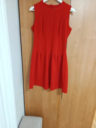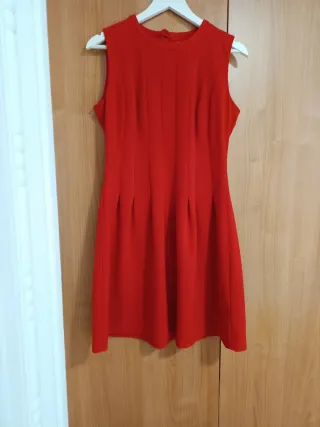Vestido de corte clásico en color rojo. - Diseño sin mangas. - Detalle de pinzas verticales en el delantero. - Falda con pliegues en la cintura. Medidas largo 92 cm medidas de axila a axila 46 cm medidas de hombro a hombro 36 cm medidas de cintura 42 cm medidas cadera 58 cm . Como nuevo puesto en una ocasión. Color rojo ❤️