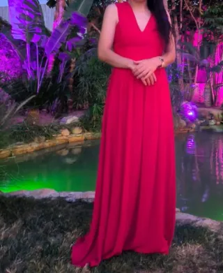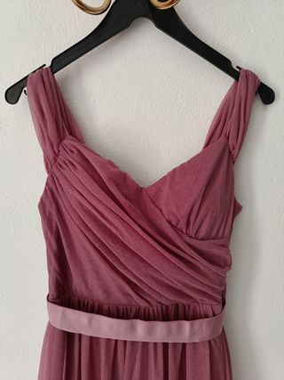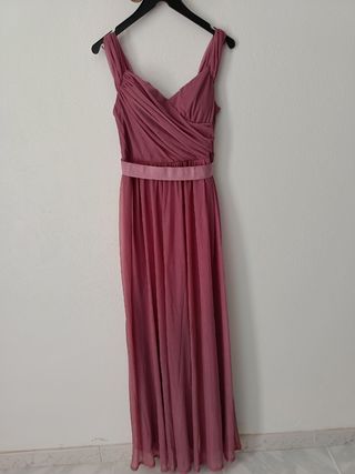 Precioso vestido largo de color rosa, ideal para una boda o evento especial. Es de un tejido ligero y fluido, con un diseño favorecedor. - Cuello en pico. - Tirantes finos. - Cintura marcada con cinturón. - Falda larga y fluida.