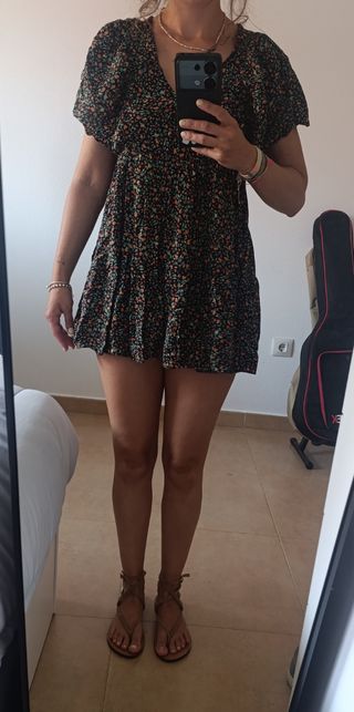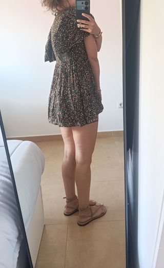 Precioso vestido corto de Zara con estampado floral multicolor. Ideal para verano. - Escote en pico. - Manga corta con volantes. - Corte a la cintura. Es corto, yo mido 1.58 y me queda cortito como se puede ver en la foto. ¡Precioso!