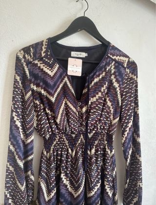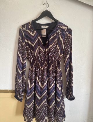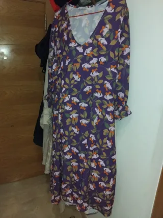 Precioso vestido de talla L con un estampado geométrico en tonos morados y multicolor. Es una prenda elegante y versátil, ideal para cualquier ocasión. Precio original 28,99€ - Diseño con cuello redondo y manga larga. - Cintura elástica para un ajuste cómodo. - Confeccionado en una tela suave y ligera. #vestido #mujer #moda #elegante #mujeres #ropa #vintage