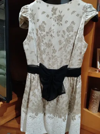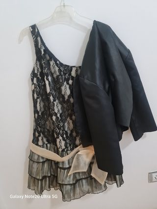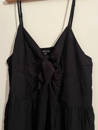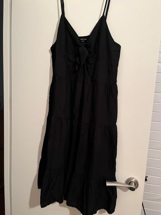 Precioso vestido negro, talla 42. Es un vestido de tirantes, con un bonito lazo en el pecho y una falda de vuelo con tres niveles. Está en muy buen estado, listo para lucir.