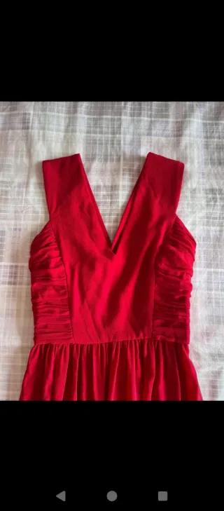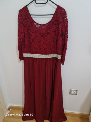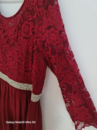 Precioso vestido largo de color rojo. Es de encaje en la parte superior y tiene un cinturón brillante. Ideal para ocasiones especiales. - Talla: (Añadir talla) - Largo: Largo - Manga: 3/4 - Cierre: Cremallera (Añadir si tiene) - Material: Encaje y gasa