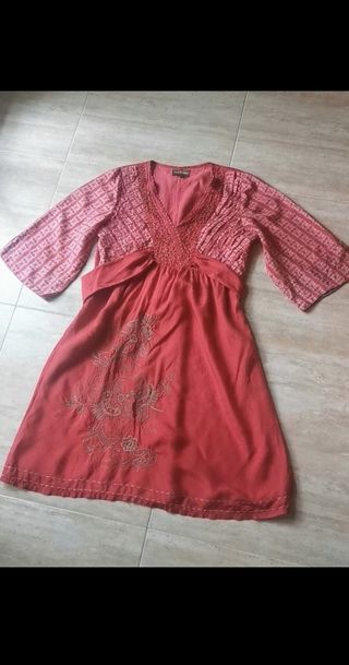 Vntd2 Ma2. N cjn cmd blnc hbtcn plnch *Vestido de talle alto, forrado, con manga francesa ancha y abierta, color granate con estampado muy bonito, de tejido 100x100 seda, para chica/mujer. De Surkana, talla M 38. Medidas: 45 cm de sisa (90 cm de contorno de pecho y 93 cm de largo. Muy buen estado. Hago envíos