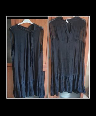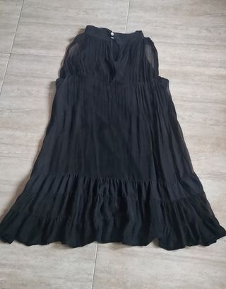 Ma2. Jni *VESTIDO negro, con forro elástico, de tejido exterior similar a la seda, transparente, sin mangas, con volante en el final de la falda, para chica/mujer. De Zara, pero no lleva las etiquetas, talla L 40. Mide 53 cm de sisa (106 cm de contorno de pecho) y 88 cm de largo. Es comodísimo. No transparenta porque lleva forro completo. Usado, pero en muy buen estado. Hago envíos