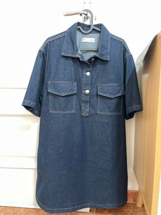 Precioso vestido camisero vaquero de Primark, talla M. Es de color azul y tiene un corte clásico. - Mangas cortas. - Dos bolsillos de plastrón. - Cierre de botones.