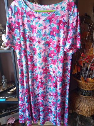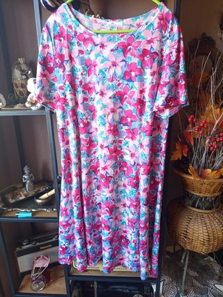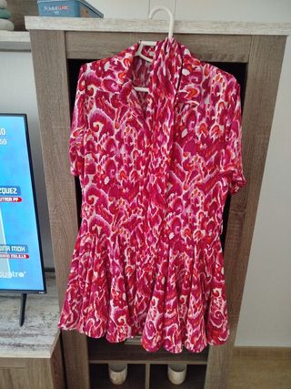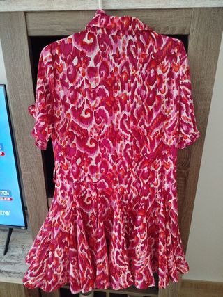 Precioso vestido corto, ideal para cualquier ocasión. Es de un color rosa y rojo precioso, con un estampado llamativo. Nuevo sin estrenar. Es anchito, da talla. - Es de manga corta. - Tiene un corte favorecedor. - La tela es suave y de buena calidad, no se arruga.