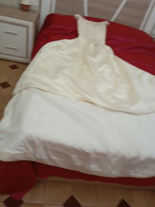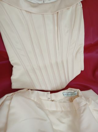 Precioso vestido de novia de Pronovias, en color beige. Se compone de dos piezas: un corpiño con estructura de ballena y una falda. El tejido es de satén, con un tacto suave y elegante. - Corpiño con estructura de ballena. - Falda de satén. Medidas corpiño sisa 85 cintura 80 espalda 40 delante 36 falda delante1,10 detrás con cola 1,75 .Lleva bastante dobladillo para sacar si necesario