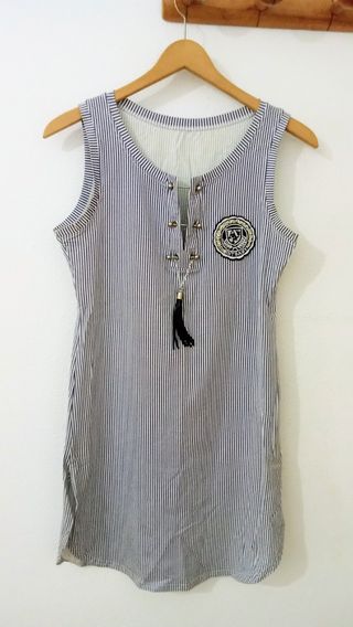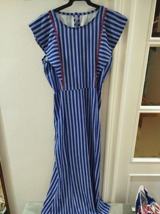 Precioso vestido estilo marinero, a rayas azules y blancas. Es nuevo, aunque no tiene etiquetas. Está perfecto. - Diseño de rayas verticales. - Cierre de acero inoxidable y detalle de borla. - Sin mangas. - Abertura a los lados - Ligero y fresco - Medidas: - 84 cm de largo - 42 cm de sisas