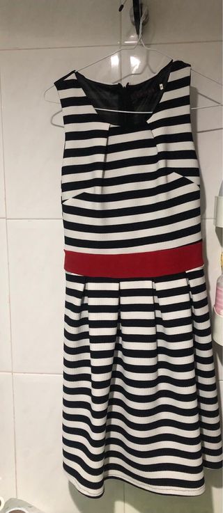 Precioso vestido a rayas, ideal para cualquier ocasión. Es una prenda elegante y cómoda, perfecta para lucir en eventos especiales o en tu día a día. - Diseño de rayas horizontales en blanco y negro. - Tiene un cinturón rojo que le da un toque de color. - Corte a la altura de la rodilla. - Sin mangas.