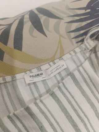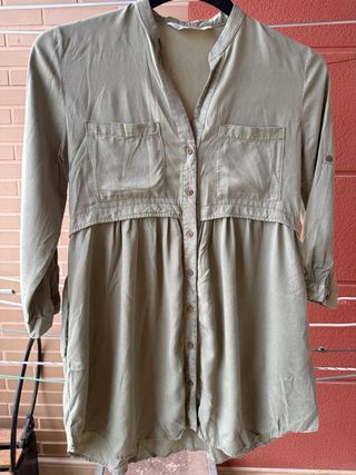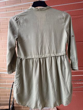 Vestido camisero de Zara en color verde oliva, talla M. Es una prenda elegante y cómoda, ideal para cualquier ocasión. - Diseño camisero con botones. - Bolsillos funcionales en el pecho. - Detalle de fruncido en la cintura. - Manga tres cuartos. Precio negociable.