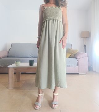 Precioso vestido largo de color verde oliva. Es de estilo casual y queda genial para cualquier ocasión. - Tirantes finos con bolitas. - Tejido suave y ligero - Pecho fruncido. Temporada verano 2024.